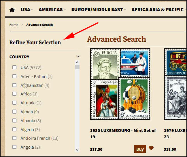 The "Advanced Search" feature helps you locate stamps from a particular country or topic quickly.